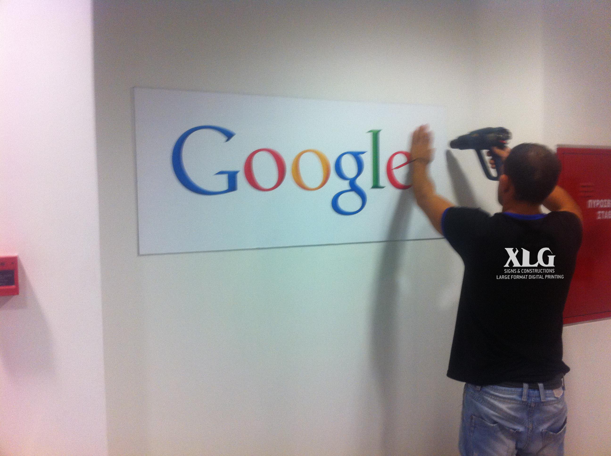 People were in the mood for playing and we supported this 100%. Thus, after we constructed the logo with galvanized sheet metal, we puttied it, painted it electrostatically in the oven, printed it on cast sticker (car dressing) and pasted on one by one letter different themes from items of the old Greek and foreign cinema. In that way, we gave a multi colored performance without, however, spoiling the logo’s aesthetics. Other projects we were asked to do were sandblasts at the offices, as well as to paste stickers on constructions in the working room. Our collaboration with Google Inc. was crowned with success and nice feelings. Thank you very much for expressing your confidence in us.